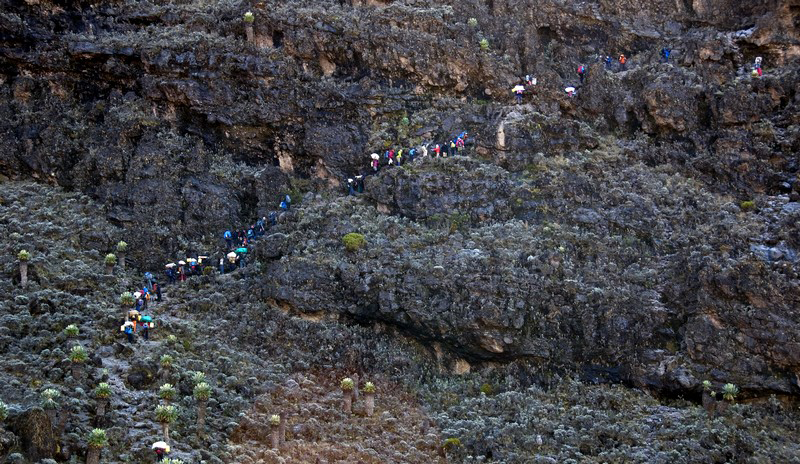 Terrain and Strenuousness: While not technically difficult, the Machame Route is more strenuous due to its steep sections, ups and downs, and varied terrain. Climbers should be prepared for challenging hiking conditions, including the ascent of the Barranco Wall, which requires some hand usage for balance.